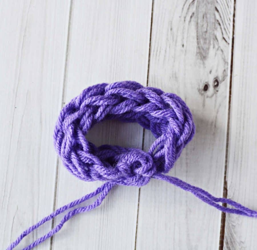 Once you have the wings of your butterfly finger knit, finish them off and tie the two ends together in a circle. Knot yarn.