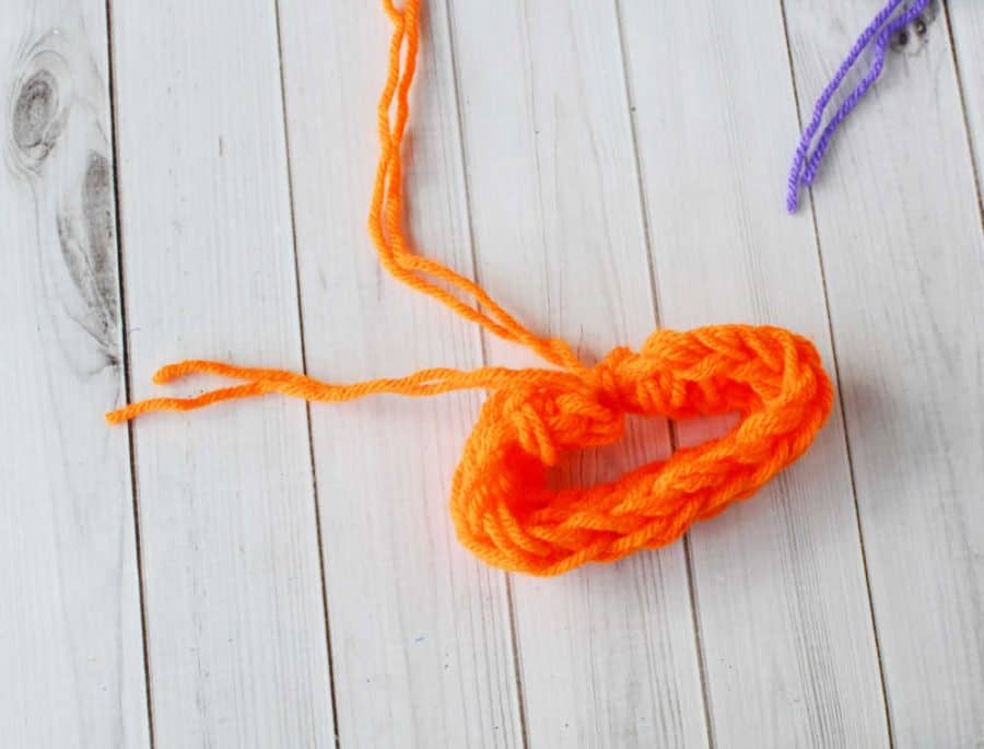 - Once you have your yellow body of the chick finger knitted, tie the tail into a knot at the top so you have a hook to hang it.