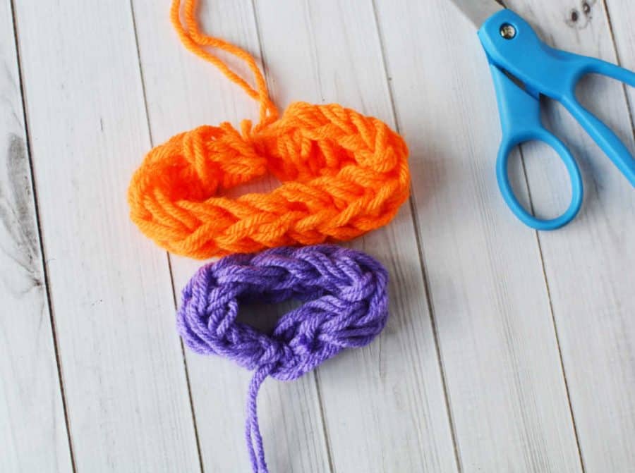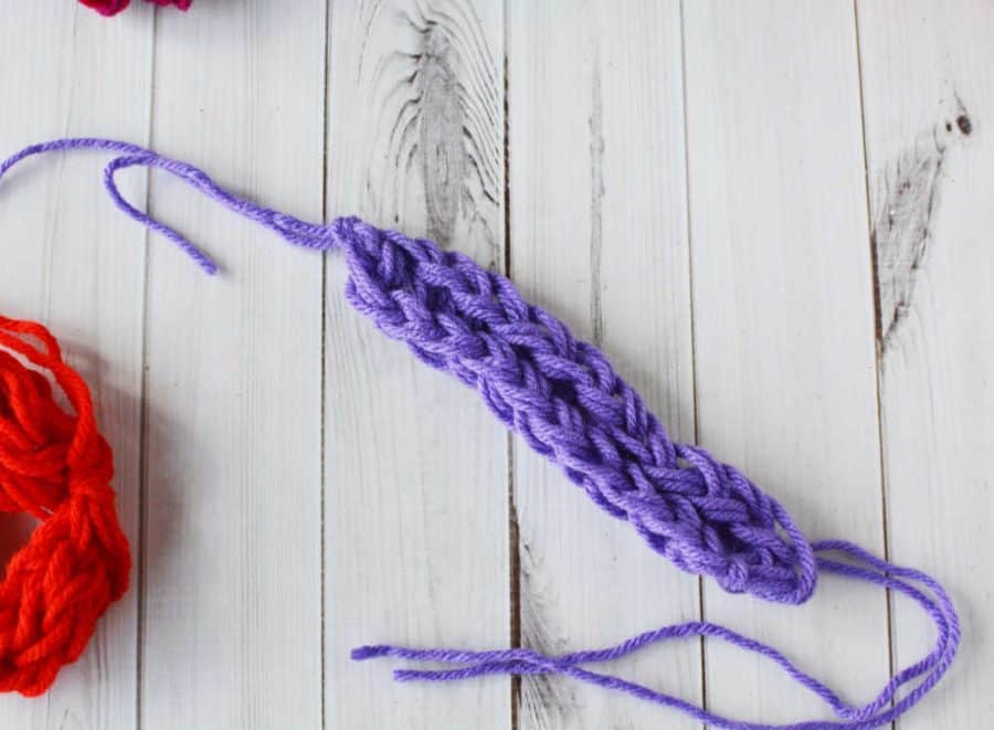 Begin by finger knitting two separate ropes of yarn. For one start with 120 inches and for the other rope use a 70 inch long piece of yarn. These will be the wings of the butterfly. Ropes will vary in size a bit depending on the size of fingers and the weight of the yarn used.