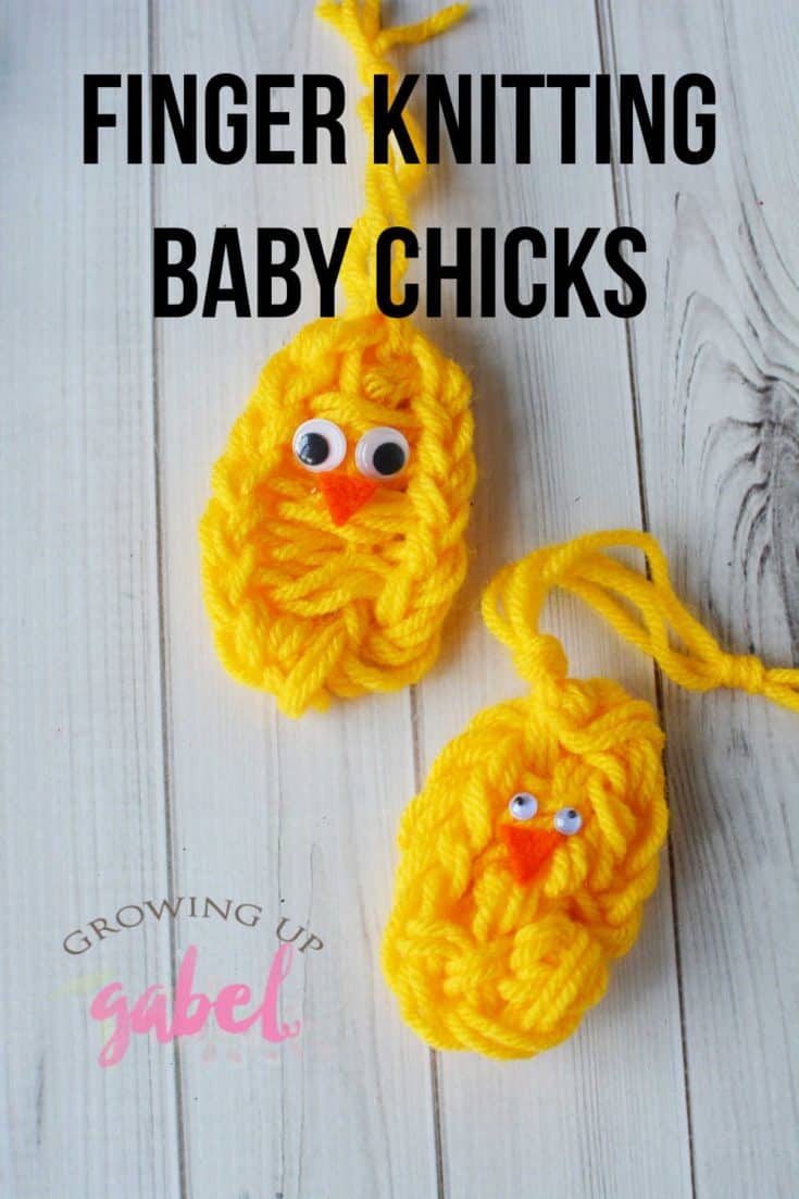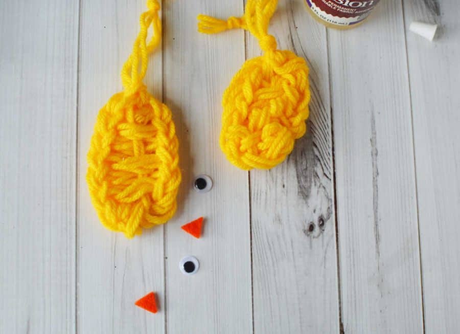 Use finger knitting to make a baby chick with yarn, felt and googly eyes.