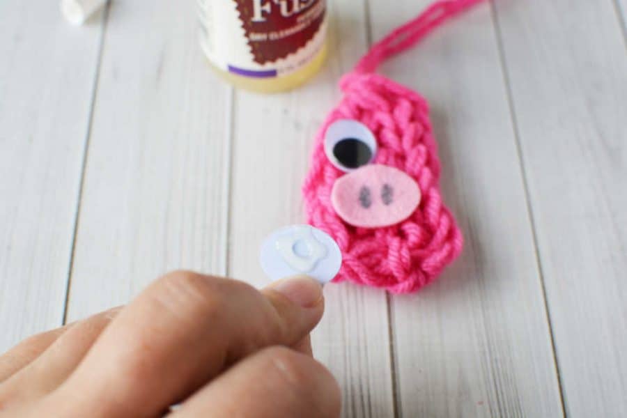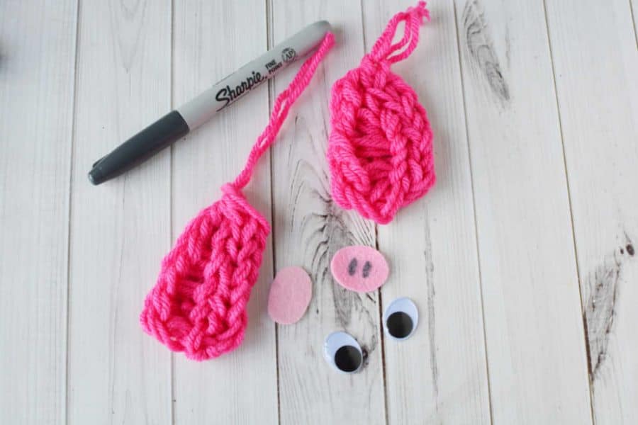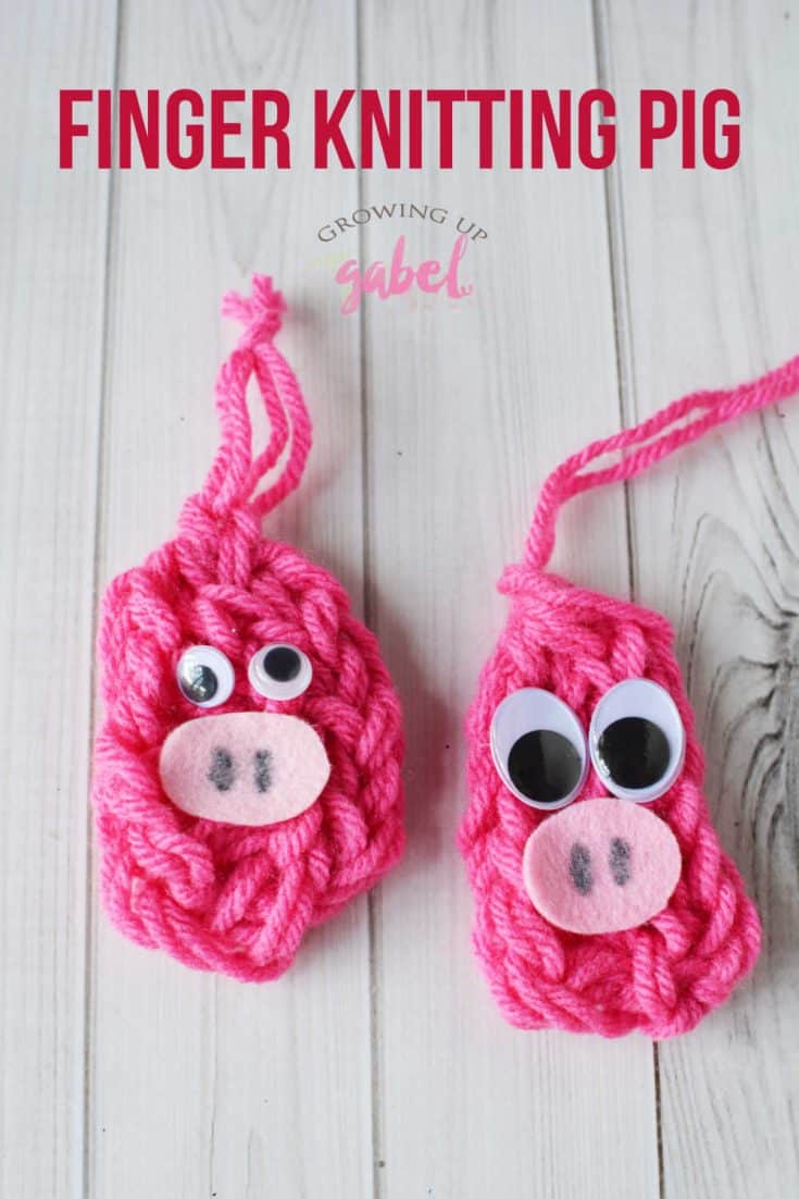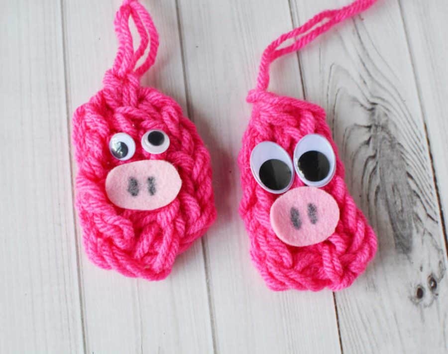 Turn your finger knitting into a cute pig using yarn, felt and googly eyes.