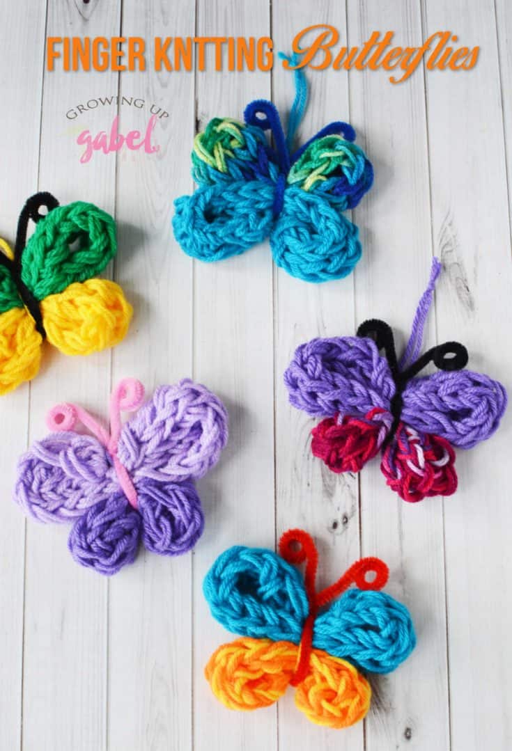 These finger-knitting patterns are for butterflies, penguins, pigs, and chicks. We are assuming that you already know how to finger-knit. If you need a tutorial, check out this finger-knitting video on YouTube. Practice a bit, and then come back and make some cute crafts. You can also grab a Finger Knitting Kit to help you get started.