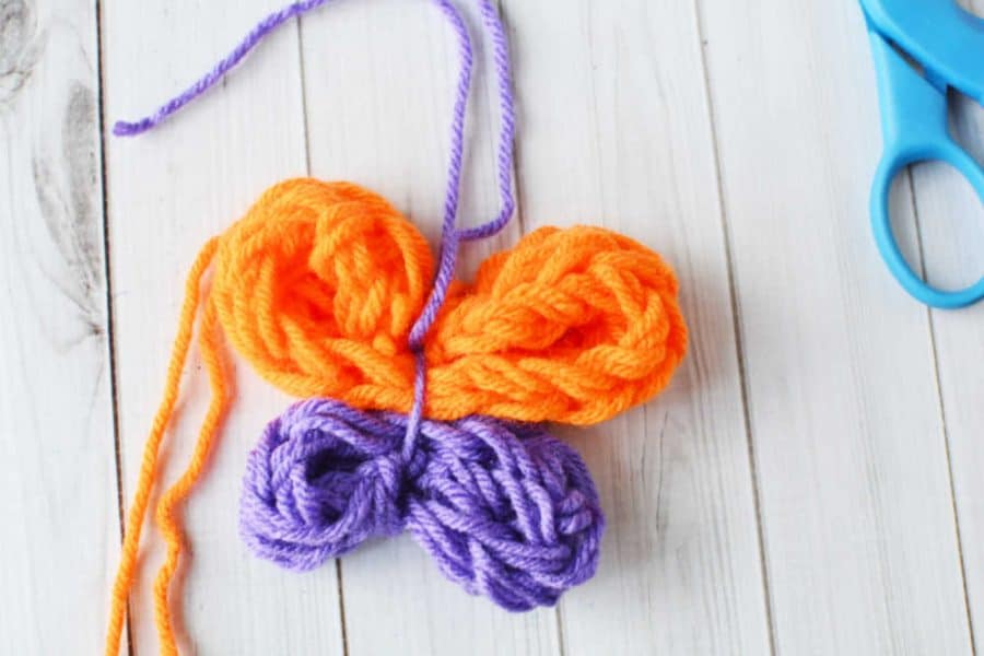 Wrap the yarn tail around the centers. Tie tightly to create wings. Tie the top to create a hanging hook or cut off if you don’t want to hang the butterfly.