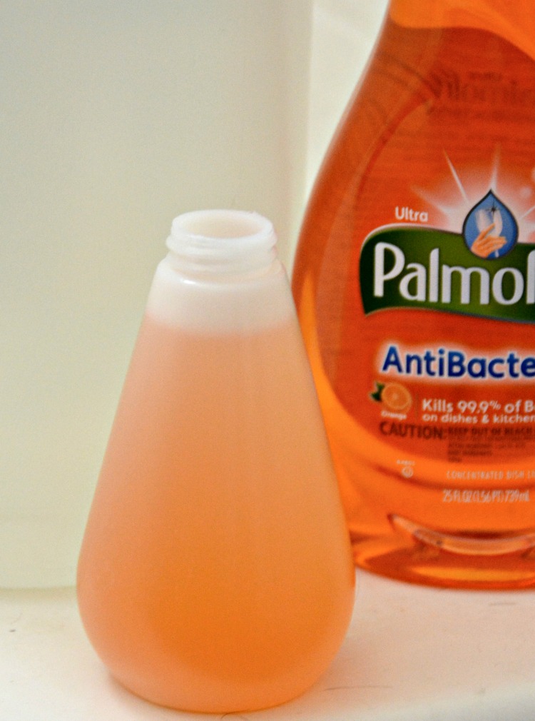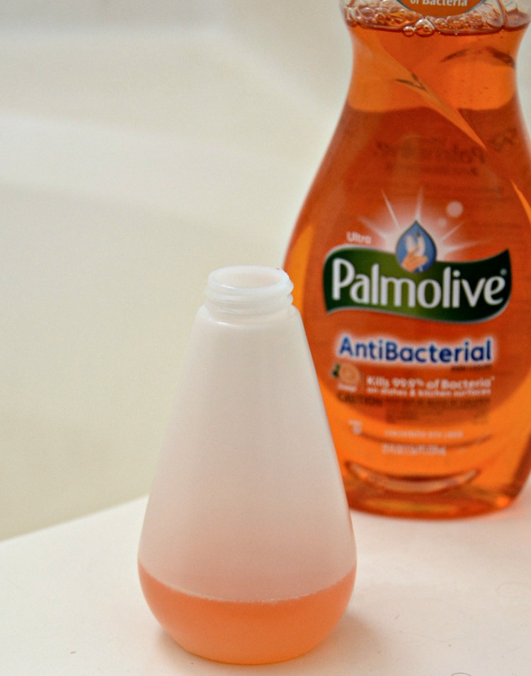 To start, fill the spray bottle 1/4 full with the dish soap. You can use any size spray bottle – just fill it about 1/4 full with the soap.