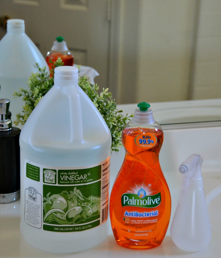 To make this cleaner you need exactly two ingredients: dish soap and plain old white vinegar. I keep a bottle of dish soap and a gallon of vinegar in my upstairs hall closet just so I can easily mix up this bathroom cleaner when I run out.
