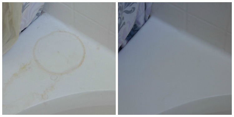 Then we have the corner of the tub where a shampoo bottle has spent way too much time. The homemade tub and shower cleaner got it all off with just a spray and a rinse.