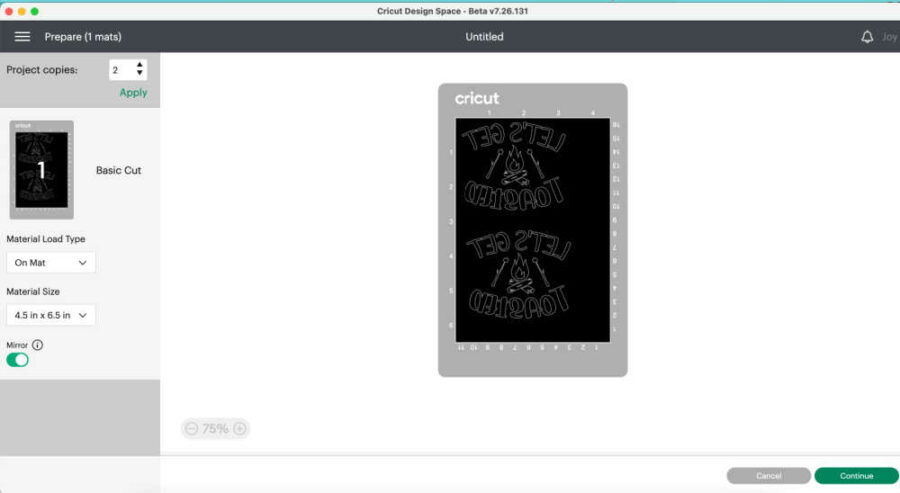 Once you are happy with how many to cut and where they are on the HTV, turn on your machine. Put the HTV on the mat glossy side down if you use a mat. Then, click “Continue” on the bottom right of the screen.