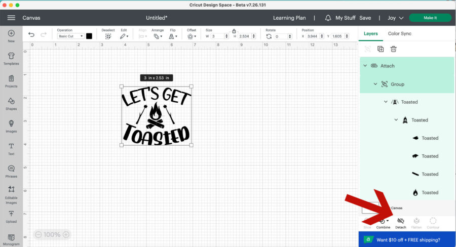 Next, highlight the SVG design and click “Attach” on the bottom right of Design Space. Now you are ready to cut.